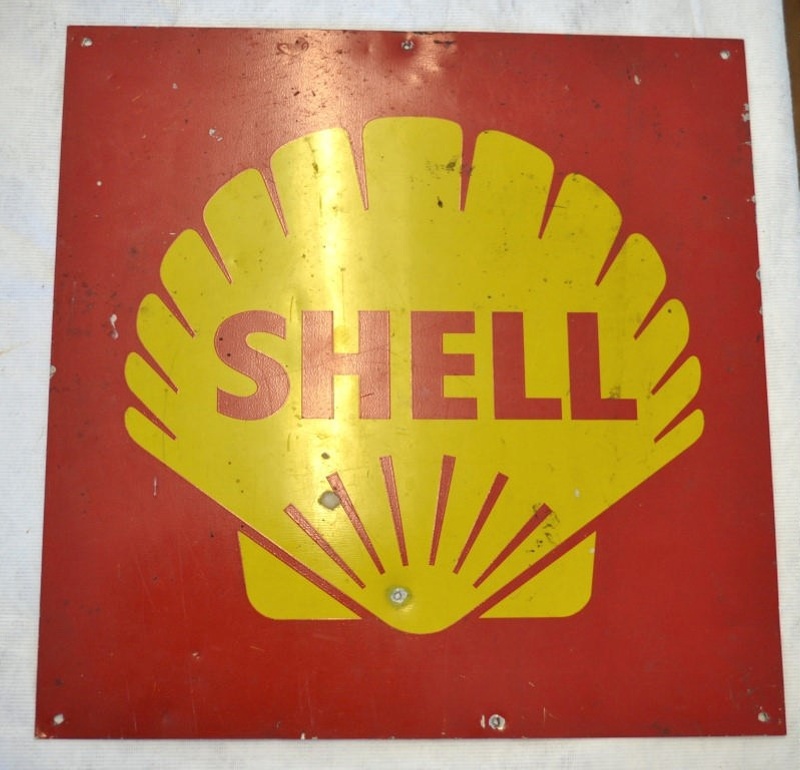 About this objectSquare painted metal sign, red with yellow scallop shell logo and "SHELL" in red. Reverse has a been used as a paint mixing tray.
