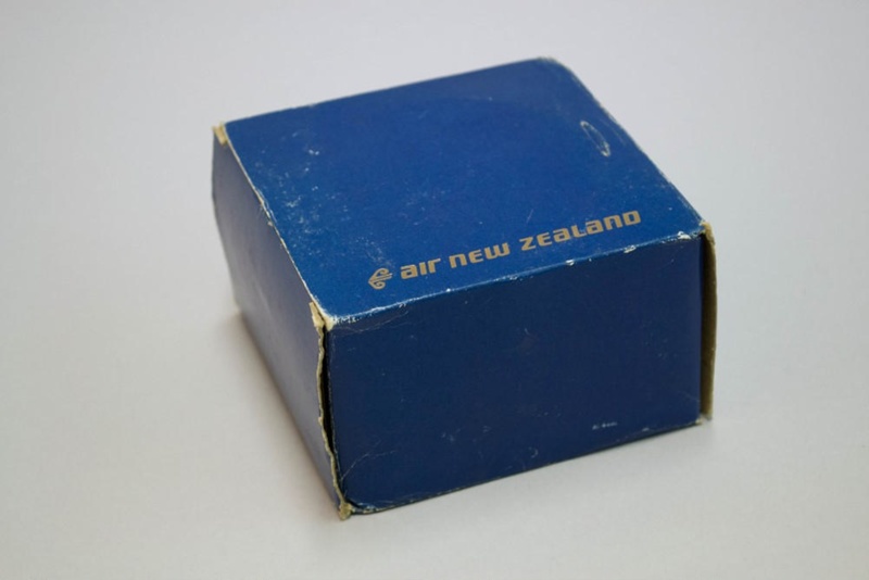 4. Box: Cardboard,square, blue, which houses the set of 3 ashtrays. The "logo" and "AIR NEW ZEALAND" is printed in gold on the front of the box.