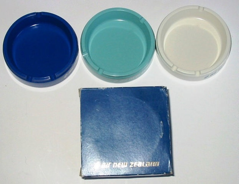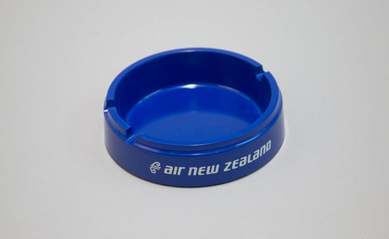 3. Ashtray: Plastic, blue. The "logo" and "AIR NEW ZEALAND" is printed around the side of the tray, twice.