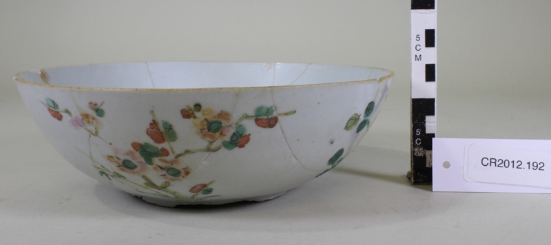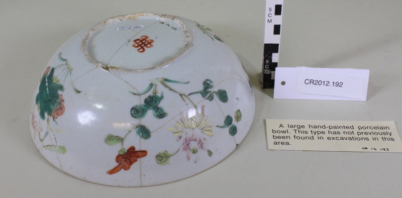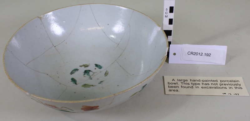 About this objectPorcelain Chinese bowl. A large hand-painted porcelain bowl. Floral design. This type has not previously been found in excavations in this area. Came from Hut 26, Chinatown excavations.